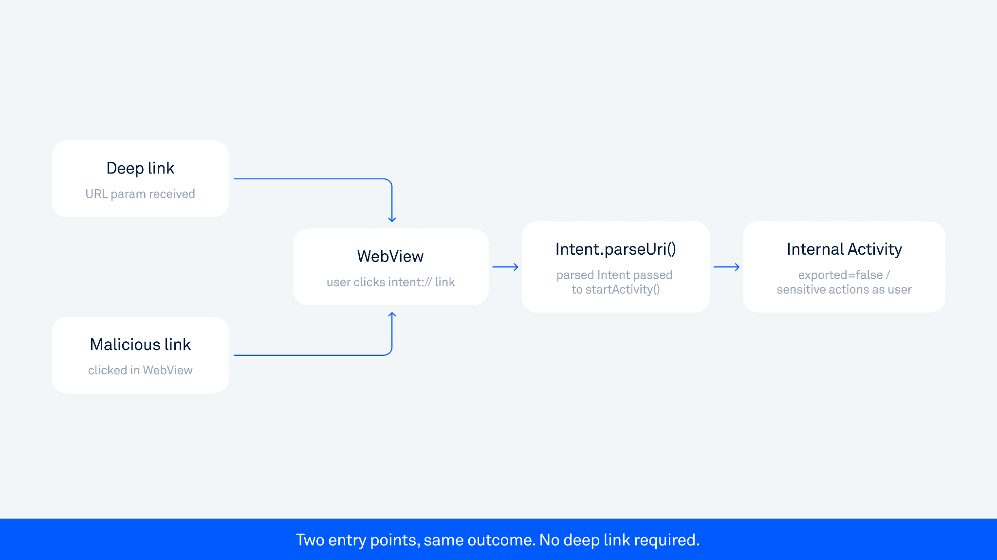 Android supports loading intent:// URLs in WebViews. If an app parses deep link URLs Intent.parseUri() and passes the result to startActivity(), an attacker can access internal, non-exported components, even if those components are declared private.