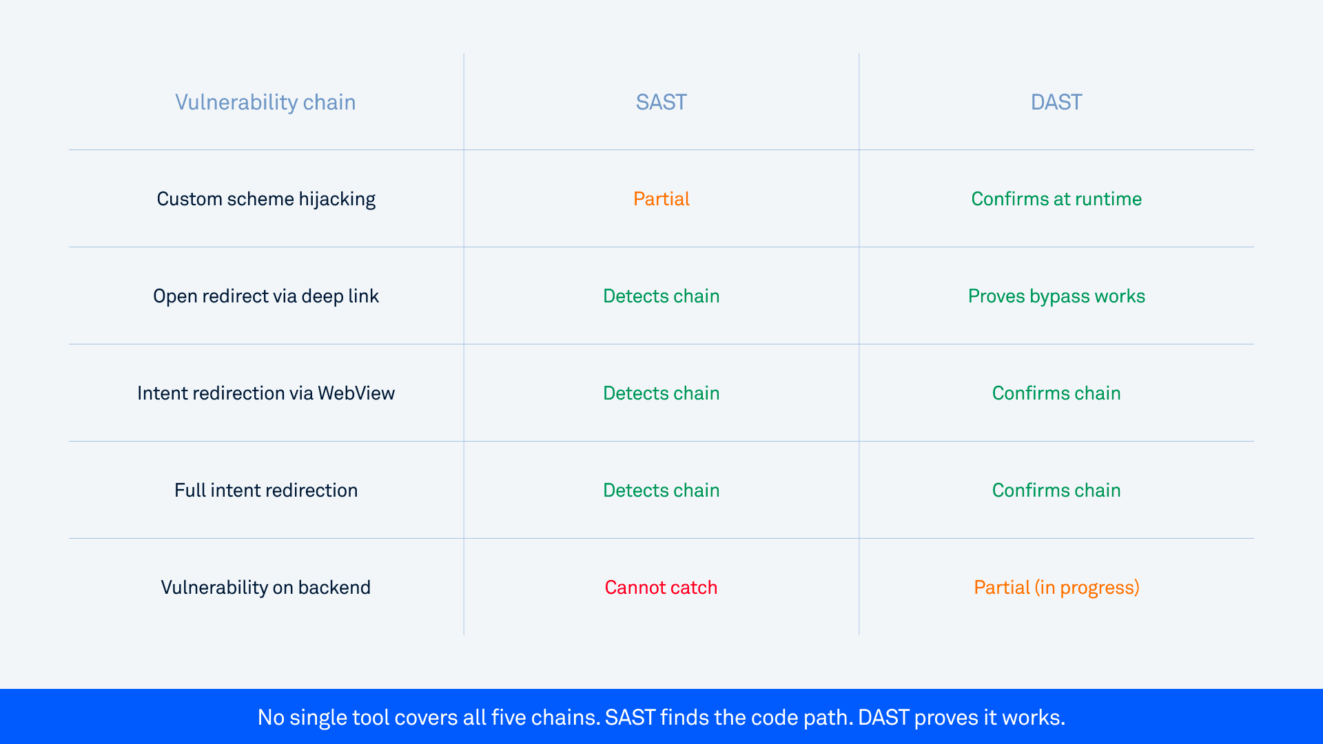 In mobile security testing, SAST traces data flow from deep link sources (URI parameters, Intent extras) to dangerous sinks (WebView URL loading, startActivity()file access, SQL queries). It catches bypassable validation - contains and startsWith URL checks are flagged specifically because they are inadequate for host validation. SAST can also trace internal deep link navigation chains, following data flow across non-exported Activities when the routing logic is visible in static code paths.