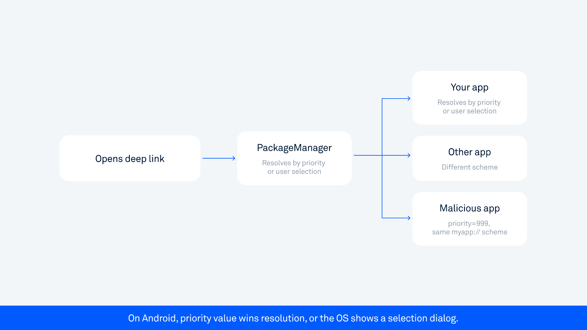 On Android, a malicious app can register the same scheme with a higher priority value (up to 999), or the OS may present the user with an app selection dialog. On Android 12+, unverified links default to the browser, but the risk shifts to OAuth flows. After a user authenticates, the authorization code returns to myapp://oauth?code=xyz. If a malicious app intercepts that callback, it may be able to exchange the code for an access token, though OAuth flows that implement PKCE (a code verifier token) reduce this risk since the malicious app would not have the verifier. Account takeover is possible but not guaranteed, depending on the OAuth implementation. This risk is not limited to OAuth flows. Any sensitive token passed via a URI callback can be intercepted the same way - password reset tokens, magic login links, or any value the app receives as a deep link parameter.