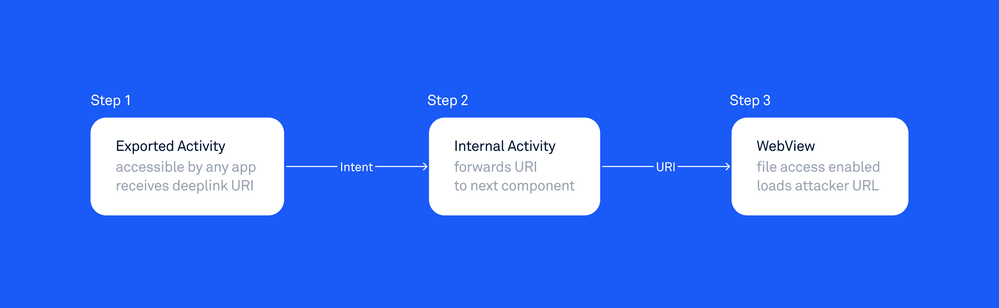 Step 1 looks harmless. Step 2 looks like normal app navigation. Step 3 appears to be a standard WebView configuration. Only when you trace the complete data flow does the vulnerability become visible.