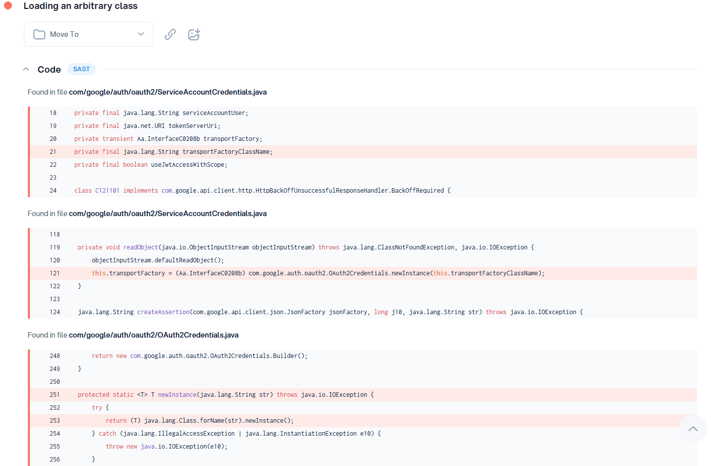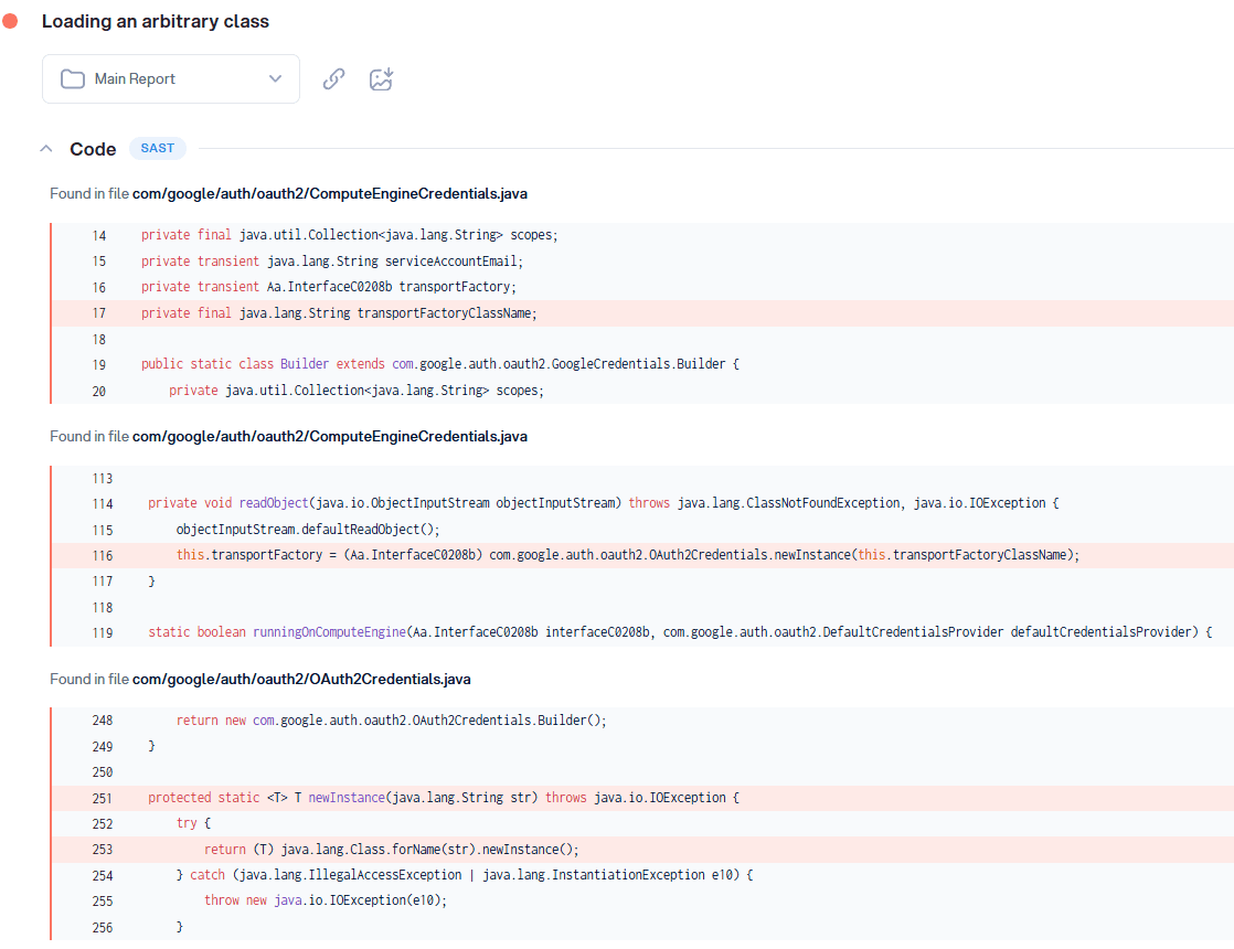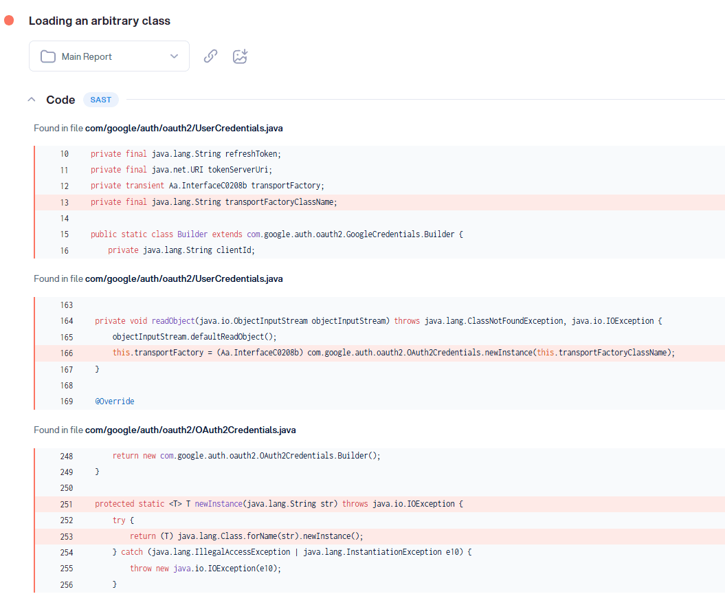 Pattern matching would flag Class.forName() as suspicious. Taint analysis goes further: it traces the full path from the attacker-controlled field through deserialization to the dangerous sink, and confirms the finding across all three affected classes in a single scan. There were three instances of the same issue, all using the same parent class OAuth2Credentials.java, so the same flow was detected in three different classes.