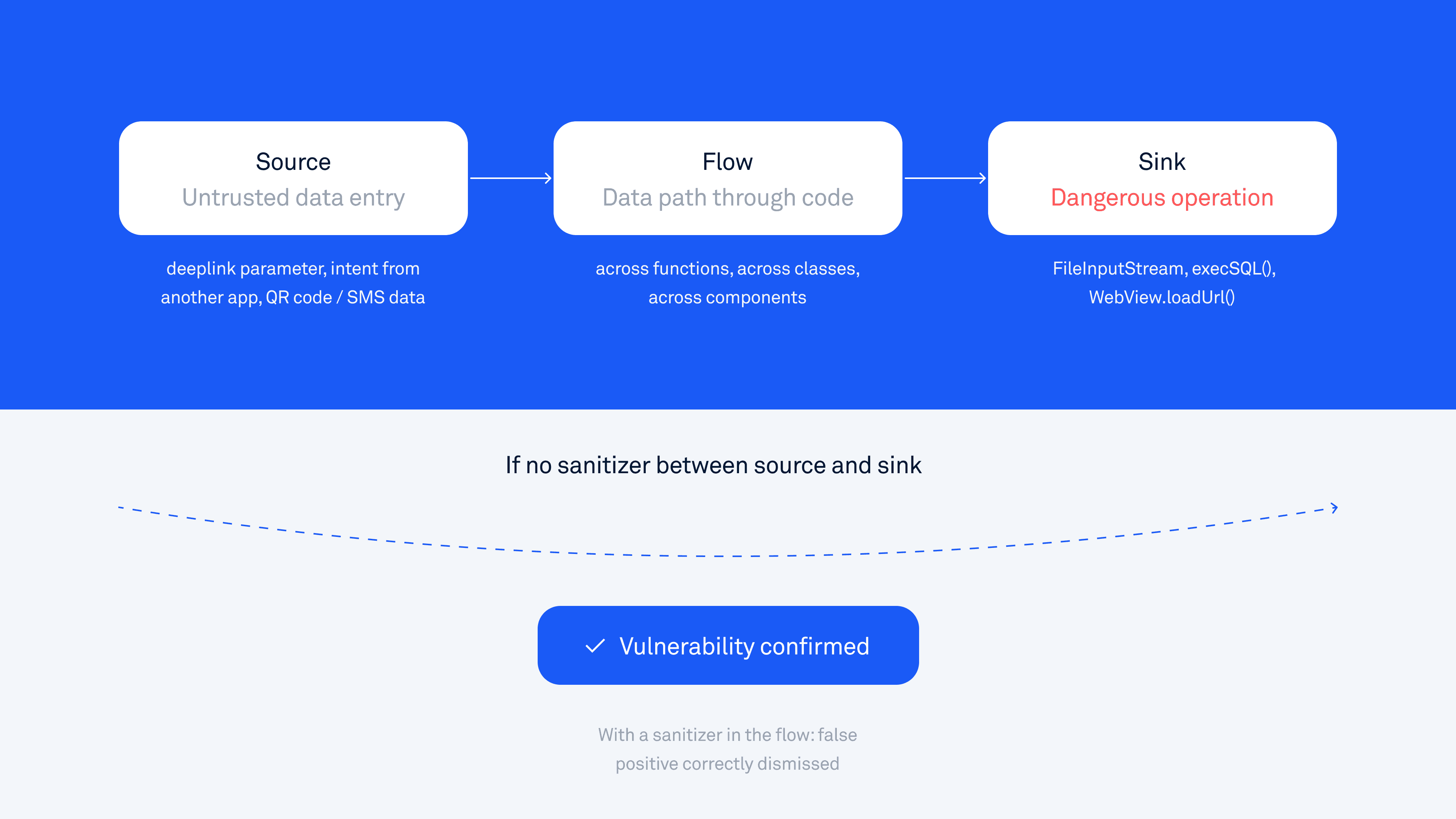 The gap between "this function call looks suspicious" and "an attacker can use this deeplink to read your users' private database" is the gap between pattern matching and taint analysis. One generates a list to investigate. The other generates a confirmed attack path to fix.