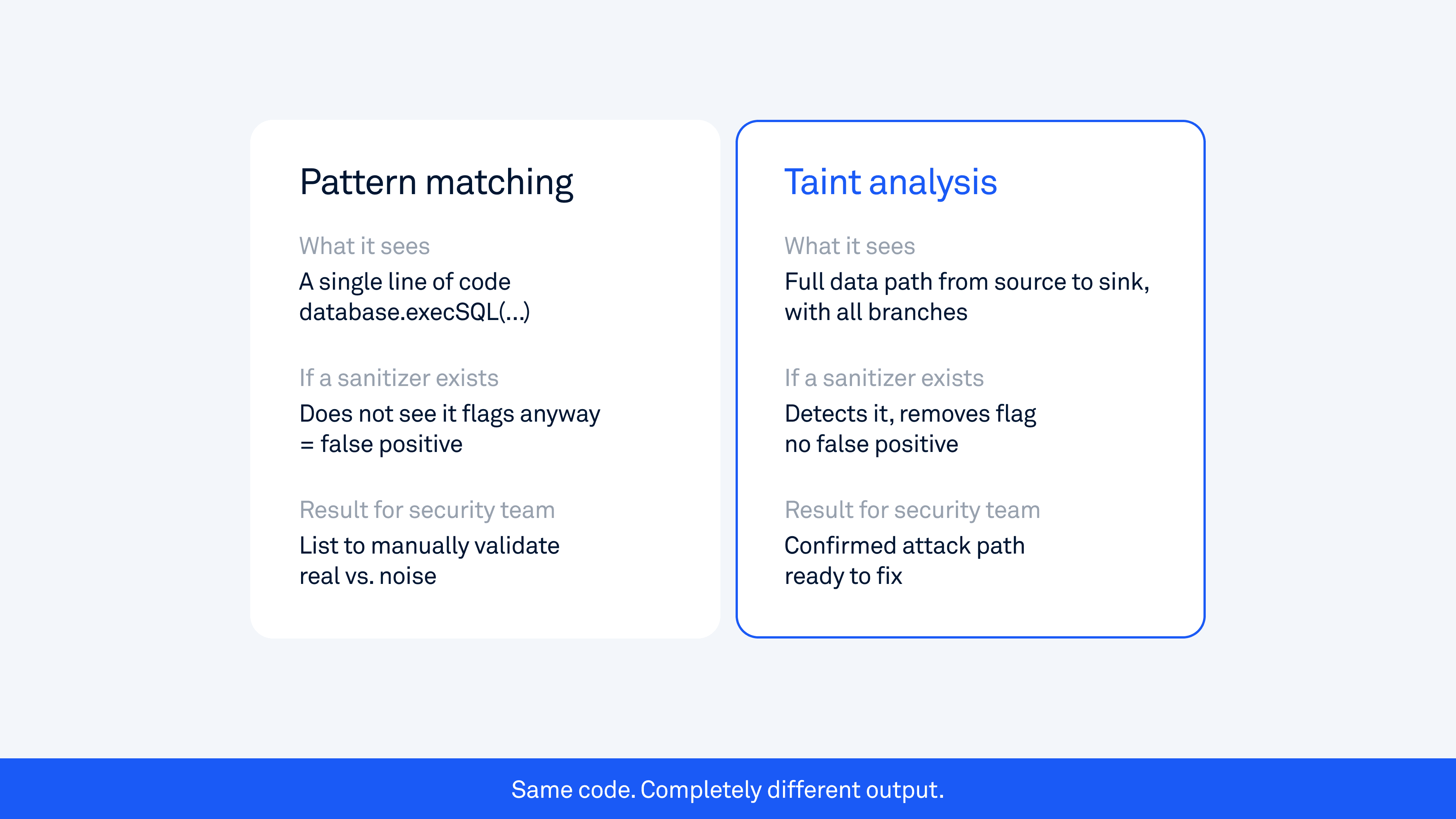 Pattern matching can't see the sanitizer. Taint analysis can. Beyond sanitizers, taint analysis also accounts for reachability, whether a piece of code can actually be reached with malicious input. Pattern matching flags every suspicious call it finds, even code that is never executed in a real attack scenario. Taint analysis only confirms a finding when the full path from source to sink is actually reachable.